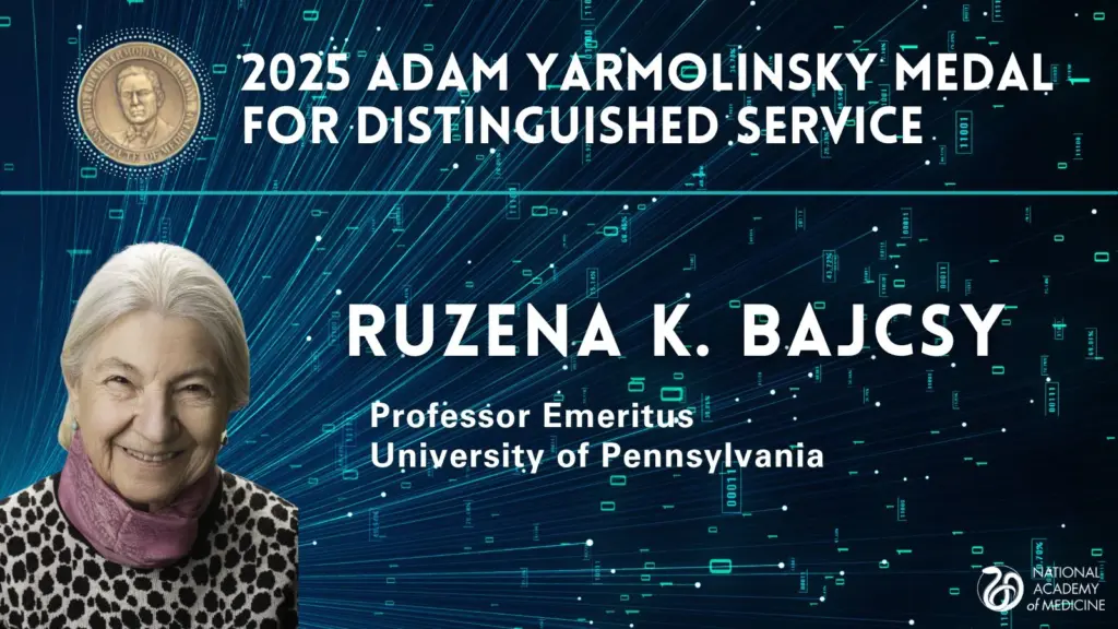 The Adam Yarmolinsky Medal is awarded to a member of the National Academy of Medicine from a discipline outside the health and medical sciences — this may include (but is not limited to) natural, social, computational and behavioral sciences, law, administration, engineering, business, environmental health, data sciences, and basic life sciences.