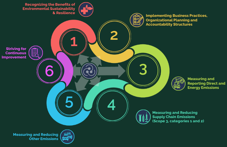 The journey map is circular, meaning organizations can revisit different stages to address regulatory, scientific, business, or other factors that develop while on their sustainability journey.