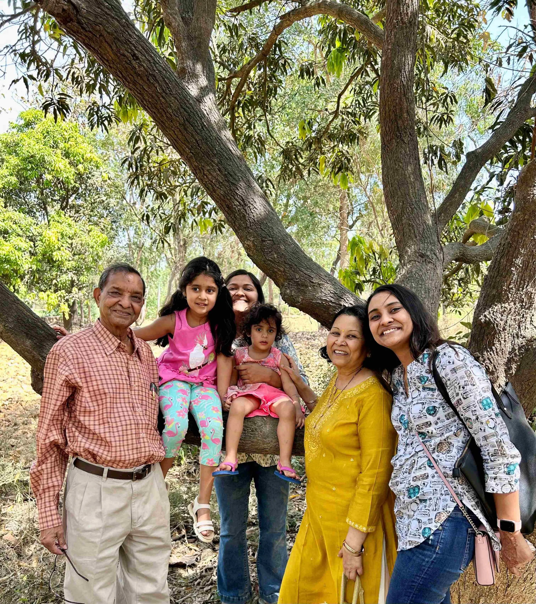 Jain (far right) and her family visit their mango orchard in her father’s ancestral village. Photo courtesy Snigdha Jain