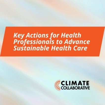 The Climate Collaborative’s work focuses on health care supply chain; health care delivery; health professional education and communication; and policy, financing, and metrics.