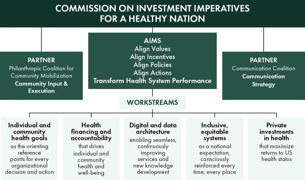 The Commission on Investment Imperatives for a Healthy Nation (the Commission) will identify opportunities and priorities for building the broad, cross-sector alignment required to overcome the core health system fragilities identified by Emerging Stronger and realize a more efficient, effective, equitable, and resilient health system. The Commission will assess the costs of maintaining the status quo; the gains that could be achieved from aligning incentives; and the policy, programmatic, and cultural changes needed to pave the way.
