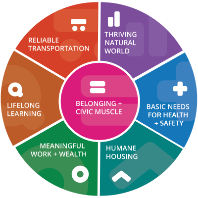 - Sustain infrastructure across public, private, and voluntary entities to create a central coordinating mechanism that strengthens belonging, civic muscle, and community
