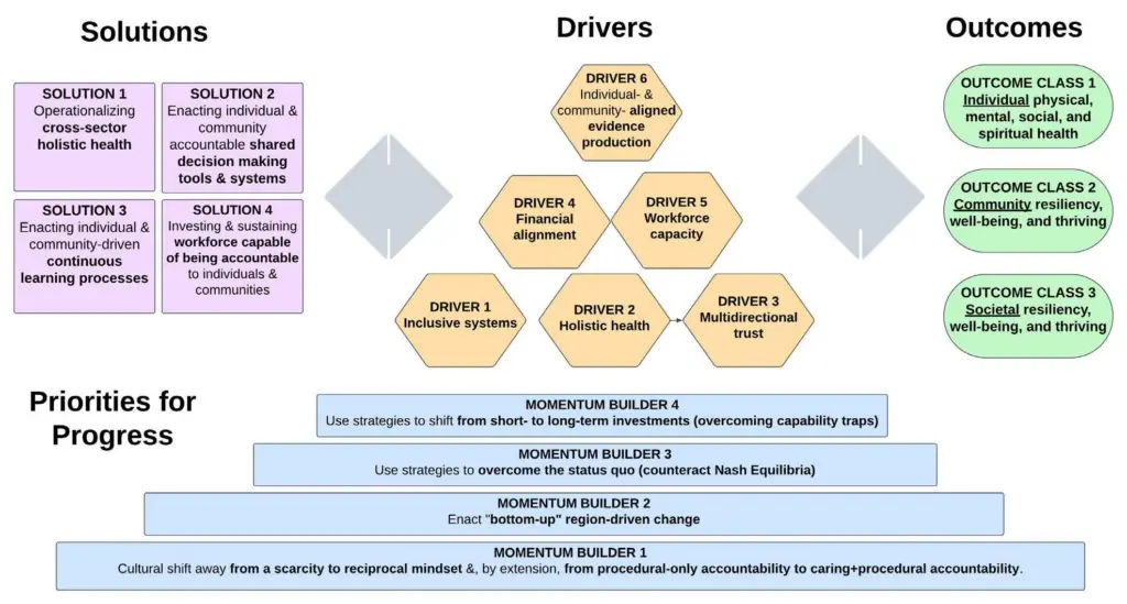 Health sector misalignment with individual and community goals and priorities remains a persistent issue. In the health care system, misalignment arises from an overemphasis on treating symptoms, acute conditions, and other challenges, rather than addressing root causes and investing in preventive services and person centered care. Reimbursement models often prioritize volume over value and outcomes (i.e., wellness), reinforcing the imbalance. Within the health science enterprise, misalignment often appears when research priorities are developed and dictated by the research community, with minimal recognition of the knowledge and limited accountability to individuals and communities impacted. Within public health systems, misalignment occurs through a lack of effective democratic structures that enable the prioritization of public funds to invest in and maintain the infrastructure needed to enable communities to withstand and recover from sudden, disruptive events. This is true not only for foundational public health services, such as the coordination of vaccine services and health promotion campaigns, but also in robust collaboration across critical sectors that influence health, such as food, housing, transportation, public safety, education, economic development, and environmental sustainability. Traditional health sectors do not effectively collaborate with each other or with other crucial sectors that influence health, and the lack of coordination hinders the creation of essential vital conditions that enable everyone, in every community, to have the opportunity not just to survive but thrive.