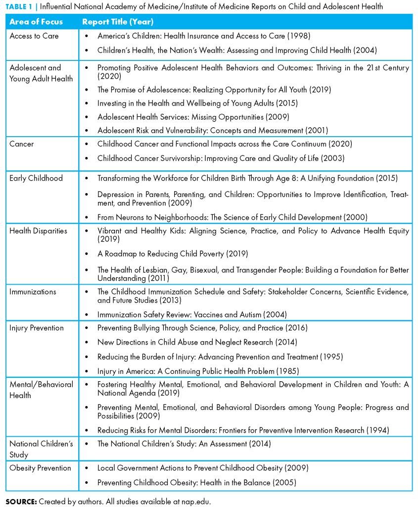 The recent 50th anniversary (2020) of the National Academy of Medicine (NAM) offered an opportunity to reflect on the breadth of studies that have addressed ways to enhance the health and well-being of children, youth, and families and, by extension, the health of all Americans. Numerous committees, workshops, and reports of the Institute of Medicine (IOM)/NAM and the National Academies of Sciences, Engineering, and Medicine (NASEM) have addressed these questions (Table 1). Increasingly, NASEM has broadened its commitment to family-centered health, including family and community voices in recommendations for change. This commitment and inclusion of community-based participatory research have strengthened the evidence base for all studies and improved equity. This perspective reviews major IOM/NAM/NASEM studies and considers critical areas for the future, including research needed to ensure continued improvements in the health and well-being of children, youth, and families. We focus on two broad themes and their impact on health and health care: (1) child/adolescent development and the life course and (2) prevention.