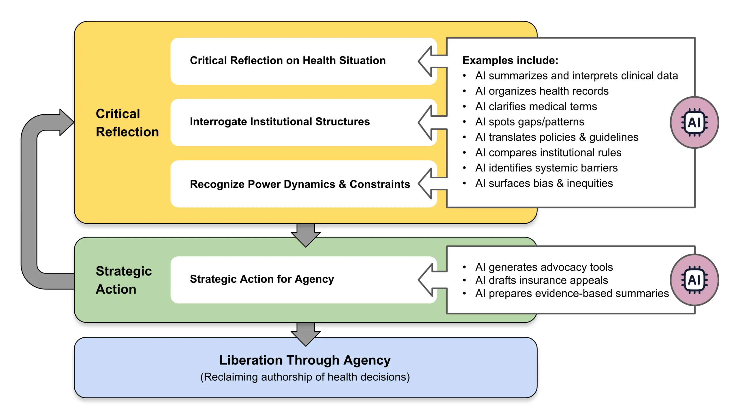 Critical Reflection: Critical reflection involves analyzing one’s health condition, interrogating institutional practices, and uncovering the power dynamics across interactions among patients, clinicians, health care systems, and the technologies that shape their care. AI accelerates this process by helping patients explore treatment options, compare clinical guidelines, review medical literature, and detect patterns in fragmented health data that may otherwise remain hidden (see Box 1).