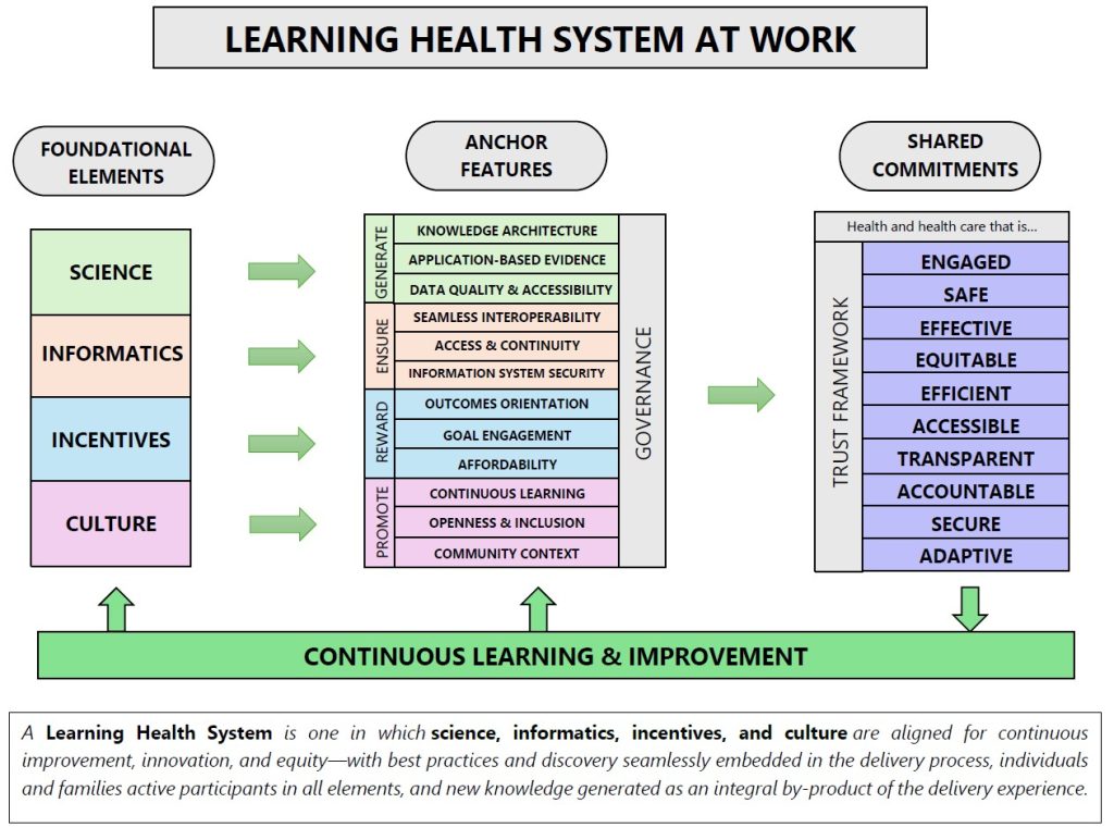 Coupled with the four foundational pillars of the LHS definition—science, informatics, incentives, and culture—the trust framework of the commitments provides understandable organizing elements for institutional clarity and motivation, and to unify expectations among organizational leaders and those they serve. Inasmuch as these two components offer the “what” and the “why” of the LHS, a start on the “how” is offered in Figure 1’s presentation of the anchor features, the building blocks necessary to move from concepts to actions to results.