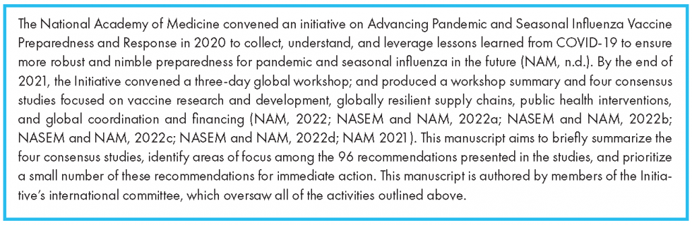 This threat is urgent and real, and is the reason the National Academy of Medicine (NAM) launched the Advancing Pandemic and Seasonal Influenza Vaccine Preparedness and Response Initiative (the Initiative) (NAM, n.d.). To rapidly identify the lessons learned from COVID-19 and capitalize on innovations in vaccine research, development, manufacturing, equitable distribution, allocation, and administration, the U.S. Health and Human Services Office of Global Affairs asked the NAM to establish an International Committee to inform and facilitate the Initiative. Members of the International Committee have long-standing global experience in vaccine development, public health, preparedness, health policy, and government (NAM, n.d.). The authors of this manuscript are all members of the International Committee.