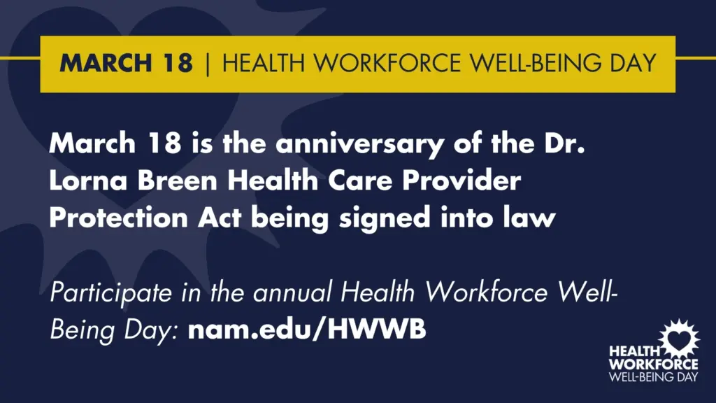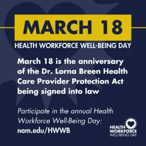In pursuit of improved health workforce well-being and patient care outcomes, March 18 is the annual Health Workforce Well-Being (HWWB) Day.